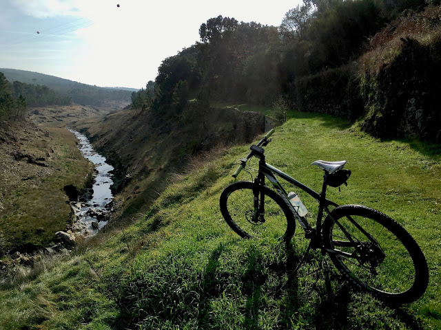 E vai um tipo por ali fora embevecido, como um puto que sai sozinho da sua rua pela primeira vez. Passei aqui há dois dias, e antes disso muitas outras, mas parece a primeira vez que por aqui pedalo. Há padrões que se reconhecem (os penedos, o azul, o brilho, pinheiro ali na curva com a poça da água de que me desviei ...), que nos comunicam alguma familiaridade mas, ao mesmo tempo, há uma mistura nova de tudo isto que cria a novidade.