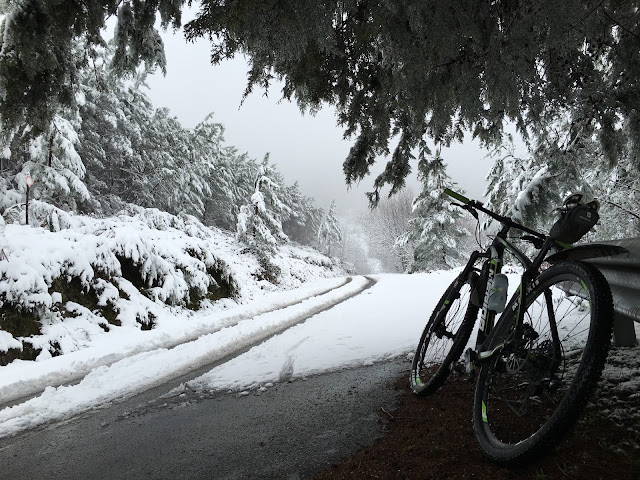 A bike estava OK e isso dava-me segurança. Comecei a descer muito devagar (mais lentamente que na subida), a bike entrava facilmente em peão. Nunca fui ao chão. Os primeiros km foram difíceis. A neve colava-se aos óculos. Baixei os óculos para a ponta do nariz, tentando que me protegessem do spray das rodas. Levava lentes de contacto e a falta dos óculos obrigava-me a fechar os olhos com frequência. Parei duas ou três vezes para sacudir a neve do casaco. A neve colava-se à bike e ao casaco. O frio nos dedos das mãos e dos pés passou a dor. Mais abaixo; à cota dos 700 m já não nevava. Foram 18 km a descer.