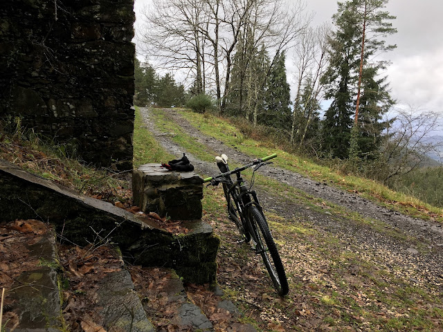 Saí dali à pressa, de outro modo passaria mais 10, 15, 20 min por ali, a diluir-me na floresta (como me disseram num comentário há tempos). Mas, logo a seguir, parei e encostei a bike. Deixa cá ver; óculos, luvas, balaclava, telemóvel, capacete .... está tudo. Eu, que sou perito em esquecer-me de coisas, tenho que fazer checks frequentes - quantas vezes não voltei para trás à procura dos óculos em cima de uma pedra (agora quando os tiro pouso-os no selim, pelo menos dou por eles quando me sento ao montar na bike), do capacete pendurado num ramo ...