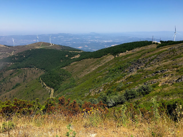 Mais uma curva e surgem os horizontes para Norte. A serra do Buçaco ao centro (cónica) e o Caramulo á direita, na linha do horizonte, antevêem-se com olhos semicerrados e a picar com o suor que escorre da testa (e pinga do nariz e do queixo) por entre as lentes dos óculos já elas também manchadas pelo suor.