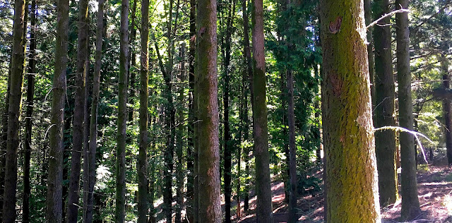 O Sol, a pique, ilumina o chão, faz clareiras mas, pelo caminho, a luz é refletida nas folhas dos carvalhos que surgem por entre os troncos escuros dos cedros, como que umas pinceladas de verde e luz