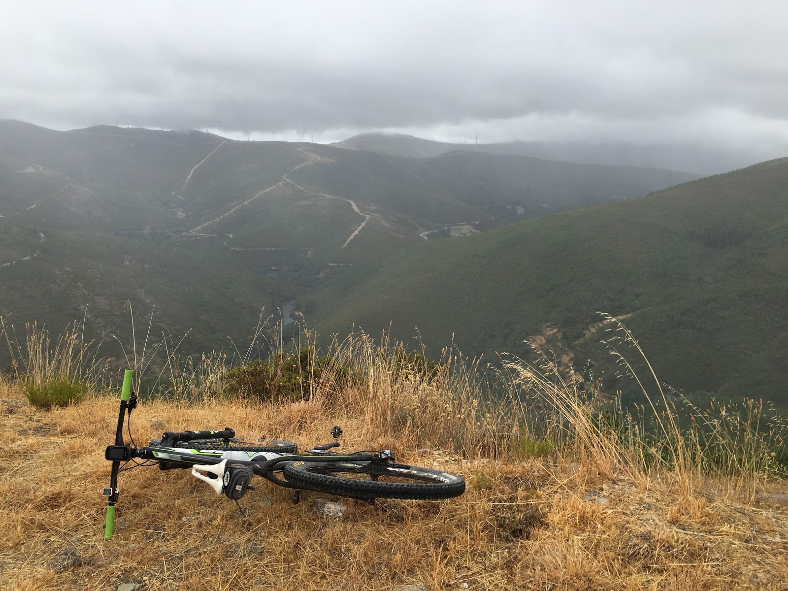Ainda pedalei pela crista uns km com enganos na estrada à mistura e voltas-atrás. À volta tudo branco, as ervas curvadas pelo vento, os óculos embaciados (sem óculos a chuva picava os olhos) e isto parece mas é a serra da Estrela (lá é que tive experiências de dias assim no pico do Verão).