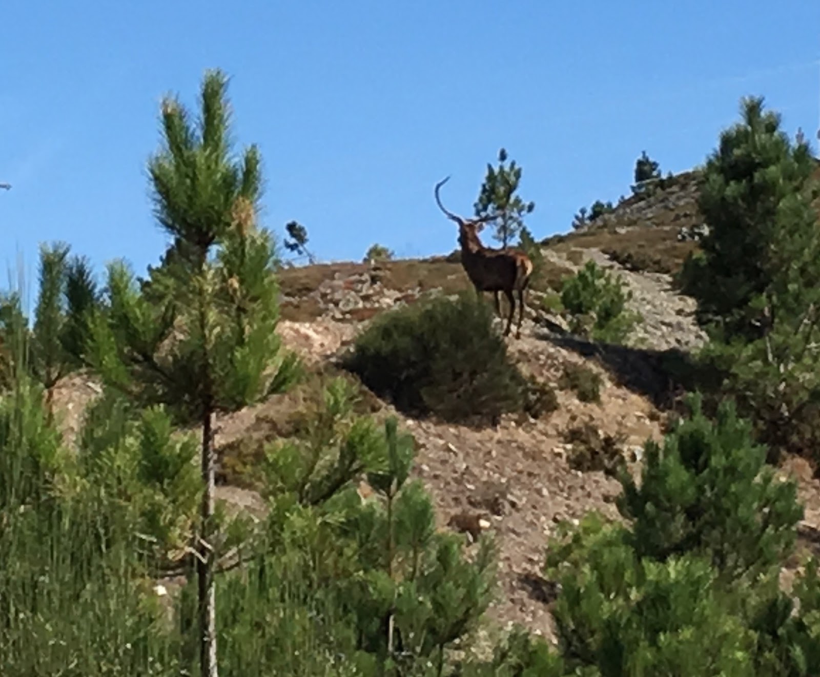 Fui espreitar, aproximando-me ao largo, em semicírculo. Com cuidado. De novo, um pouco mais à frente, mas muito perto, vi o que desta vez parecia ser uma cauda. Fiquei imóvel. Lentamente pousei o cantil e o pão no chão. Olhei em redor, tentando encontrar um pau. Porra, nada. Não me mexi. Estava na expectativa. Que caraças é que vai aparecer por entre os arbustos? Se fosse um cão teria que ser pelo menos do tamanho de um serra da Estrela. Silêncio. Eu imóvel. Nada na mão, nada na manga. Sem dar por mim (não havia vento) em leve trote, elegante, soberbo, afastando-se do local onde eu estava, surgiu de entre a vegetação um macho. Uma armação impressionante. Grande, imponente, magnífico, sem pressas, majestático, como quem percorre o seu território. Ali. Logo ali. E eu imóvel. Em silêncio. Não deu por mim. Foi indo, possante e leve ao mesmo tempo. Já vi muitos veados na serra. No dia anterior tinha feito vários avistamentos. Vários fêmeas que se assustavam à minha passagem. Setembro-Outubro é a época da brama. As fêmeas andam inquietas e os machos muito mais tentando atraí-las. No final elas escolhem. É sempre assim, as fêmeas escolhem os parceiros. Desta vez, o encontro imediato, a poucos metros, foi tranquilo. Eu imóvel e o belo macho passou calmo sem me pressentir, como se eu não ali estivesse. Afastou-se, subindo o monte, saltando (quase que voando) sobre as pedras e os arbustos. Que elegância. Então, e só então, levei a mão ao bolso de trás da camisola, tirei o telemóvel e apontei para o local onde se encontrava, já um pouco longe. Clique, clique, clique. Acho que aí ele pressentiu alguma coisa. Espevitou-se e num galope mais esforçado afastou-se. Atravessou o estradão das eólicas.