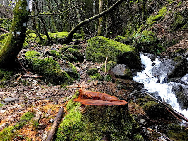 parando o olhar no musgo fluorescente, cobrindo trocos de castanheiros