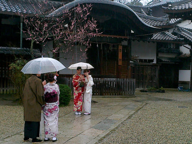 Chovia abundantemente e a visão de um parque com lagos puxou-me para lá. Antecipava a tranquilidade da chuva caindo na superfície dos lagos e nas folhas das árvores. As árvores e os arbustos começavam a florir na Primavera de Kyoto. À entrada uma cena que não antecipei. Ensopados da cintura para baixo, ali andavam estes pares a fotografarem-se mutuamente com a mesma calma, sorrisos e elegância de movimentos como se estivesse Sol e uma brisa suave.