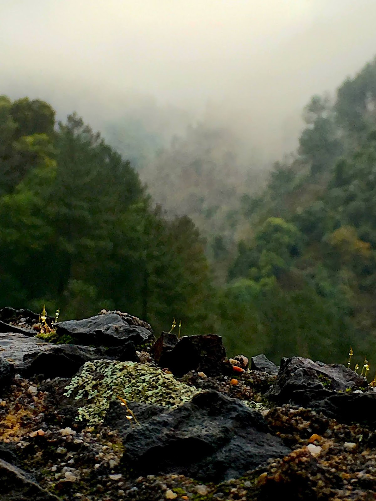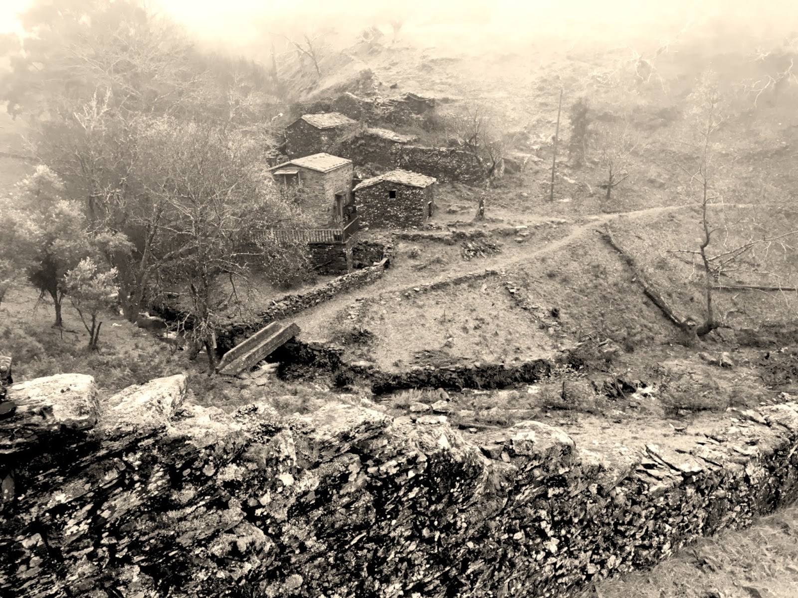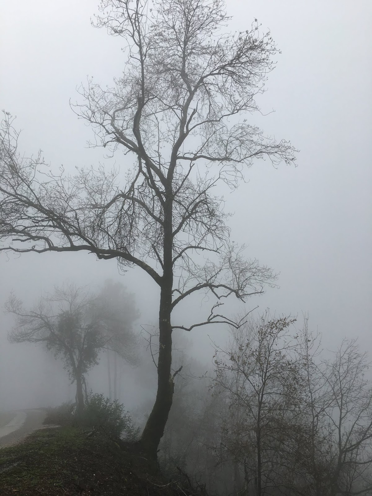 A aldeia do Talasnal recortada contra o céu branco, quase apagada da paisagem pela neblina que ora subia ora andava por ali às voltas ao sabor do vento, foi o motivo para a primeira paragem. Pela encostas acima, até à aldeia, os castanheiros misturados com carvalhos fazem uma cobertura que já não é vulgar. Foi-o há centenas de anos. A encosta íngreme torna difícil o acesso mas ali está, uma cobertura vegetal que talvez se possa chamar uma relíquia do passado, um fóssil vivo.