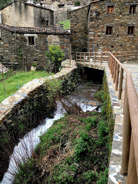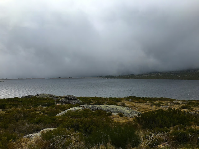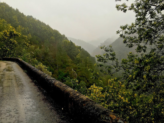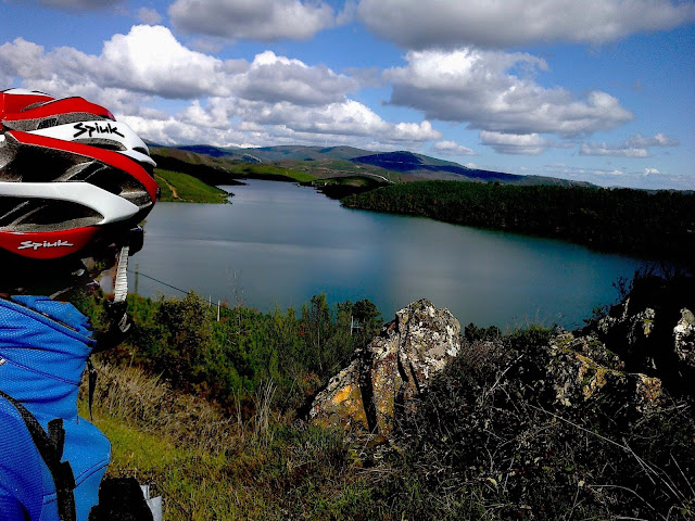 Depois das lagartas fui à vida. Tinha subido a serra por uns caminhos secos e solarengos onde encontrei as lagartas (na fotografia, com a bike encostada a um sobreiro - a variedade da flora na serra é um deslumbramento - vê-se a aldeia de xisto do Gondramaz na encosta em frente)
