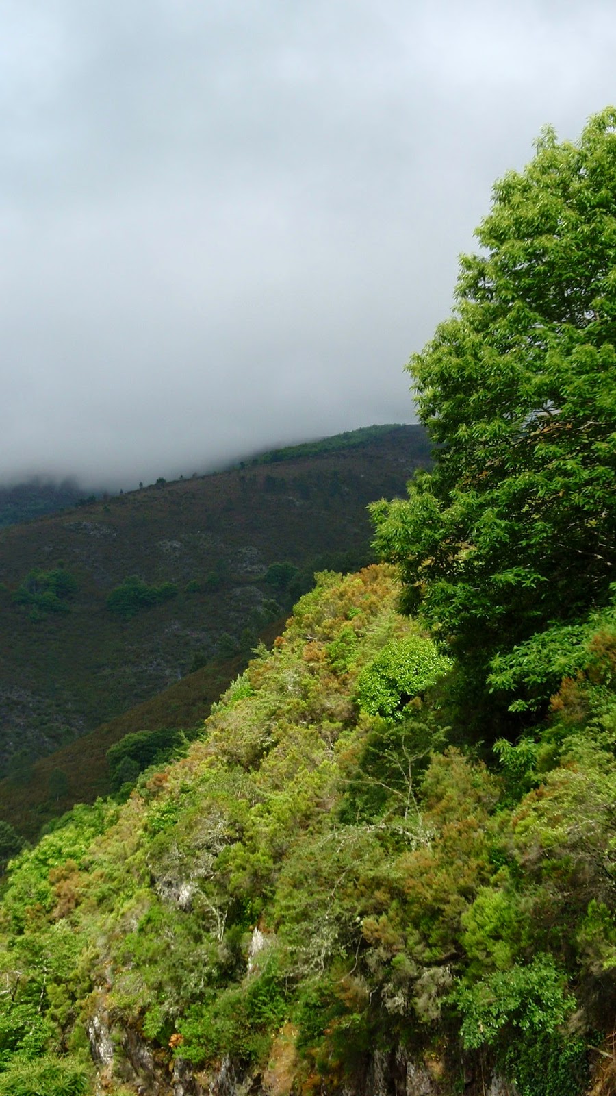 Entro na zona densa de Abetos que fecham o caminho numa abóbada e dou a volta para descer pelo terreiro das Bruxas, passando aos 800m por um carvalhal que filtra o Sol, vislumbrando-se o vale cá em baixo.
